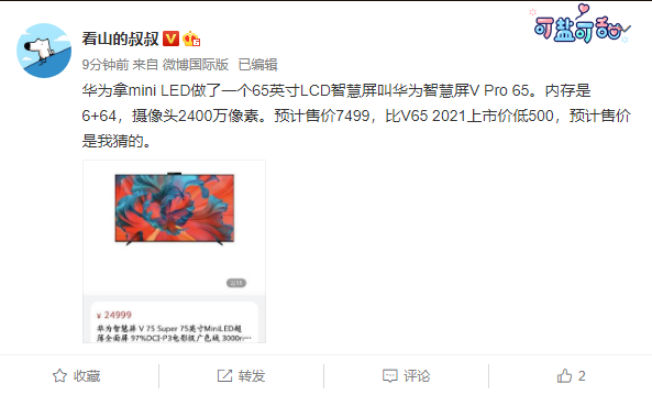 4 月 16 日消息,数码博主 @看山的叔叔 称,华为新的 65 英寸 LCD 智慧屏叫华为智慧屏 V Pro 65,采用 mini LED 面板,内存是 6+...